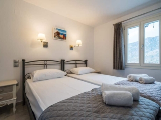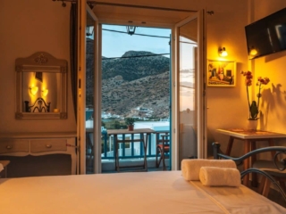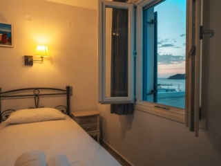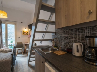 A separate accommodation proposal for a family or a group of friends is the quadruple room with the attic. This apartment has all the amenities. It consists of a room with a double bed, while it has an internal attic that is formed into a bedroom with two single beds. It also has a kitchenette with the necessary household utensils and a dining table. Its decoration with earthy colors creates an intimate atmosphere. It has a bathroom with a shower. Its balcony overlooks the sea.
