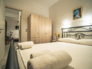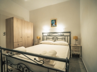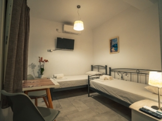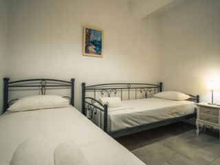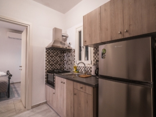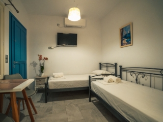 This two-space four bed apartment of Kamarados Studios offers comfortable accommodation to 4 guests. It consists of a double bedroom and a room with 2 single beds. It also has a fully equipped kitchen with the necessary household utensils for preparing meals. Its furniture and decoration is distinguished for its earthy colors. It has a bathroom with a shower while its balcony overlooks the courtyard of the complex.